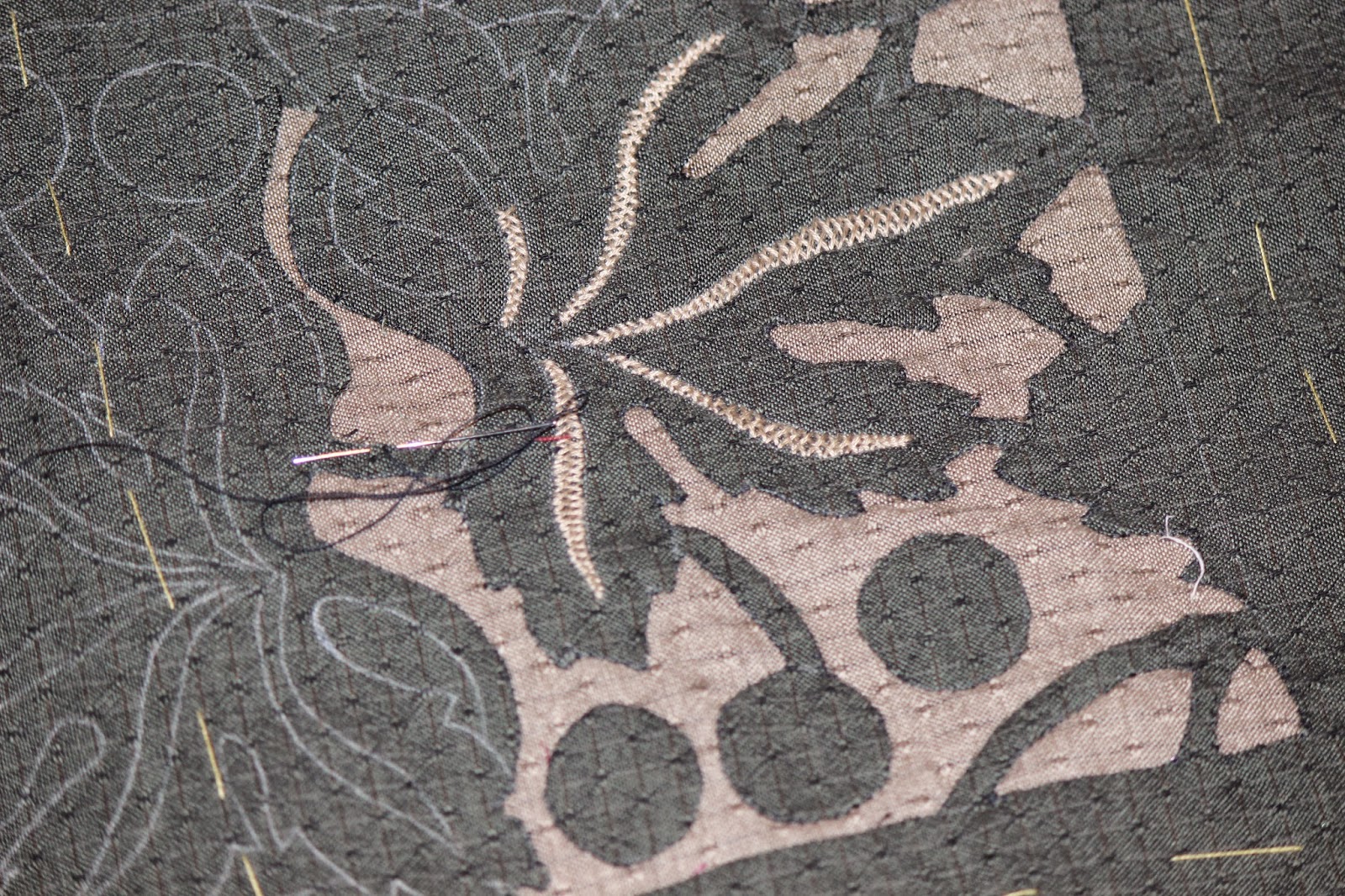 После перевода рисунка на ткань (верхнюю) соединяем две ткани вместе простыми стежками по контуру и можно по центру. Если будут мешать срежем.