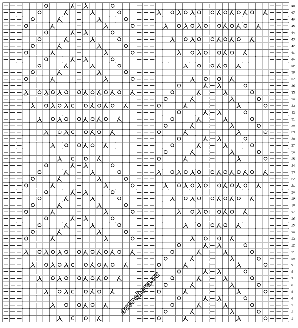 В схеме указаны только лицевые ряды, в изнаночных рядах все петли вязать по рисунку. Накиды вязать изнаночными.