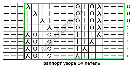 В схеме указаны только лицевые ряды. В изнаночных рядах вязать по рисунку. Раппорт узора  для 1-го ряда  14 петель, перед раппортом вяжем 8 петель, после раппорта 7 петель.