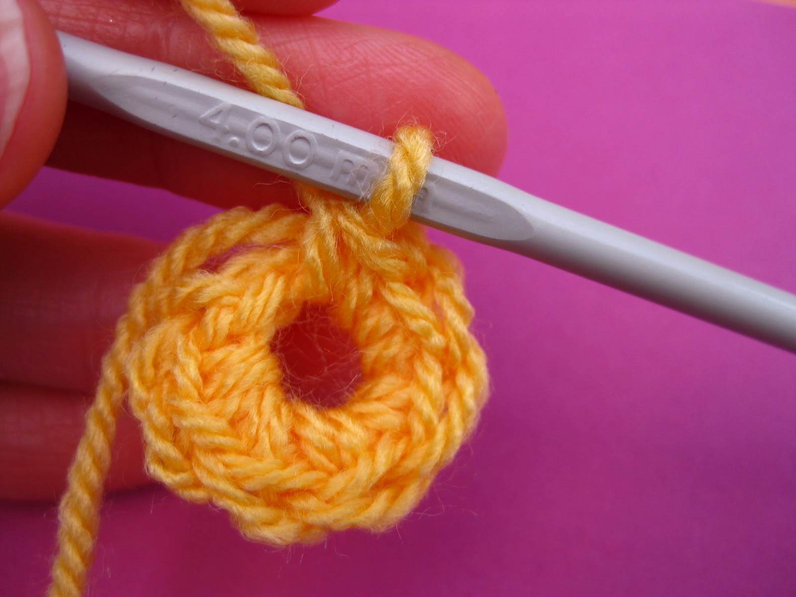 с помощью желтой пряжи.......... начать с цепочки 4 и скольжения строчки в первой ch, чтобы вступить в форме кольца...........