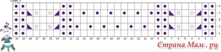 Из-за этих закрытых петель снуд лучше лежит на груди. Центральный узор - по схеме. Убирала в каждом четвертом ряду по одной петле с каждого края. Дойдя до центрального узора - убирала в каждом втором ряду.