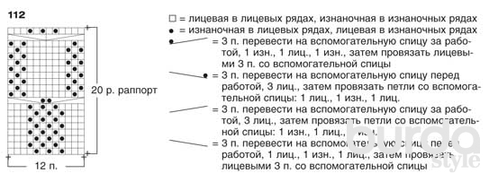 Перейти на спицы № 4 и продолжить вязание следующим образом: лиц. кром., 6 п. изнаночной глади, 12 п. по схеме, 2 п. изнаночной глади, 54 (60) 66 (72) п. лицевой глади, 2 п. изнаночной глади, 12 п. по схеме, 6 п. изнаночной глади, лиц. кром.