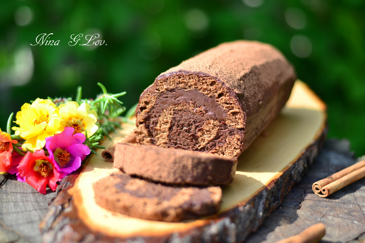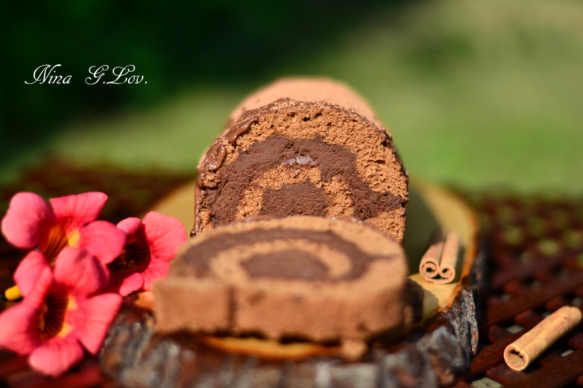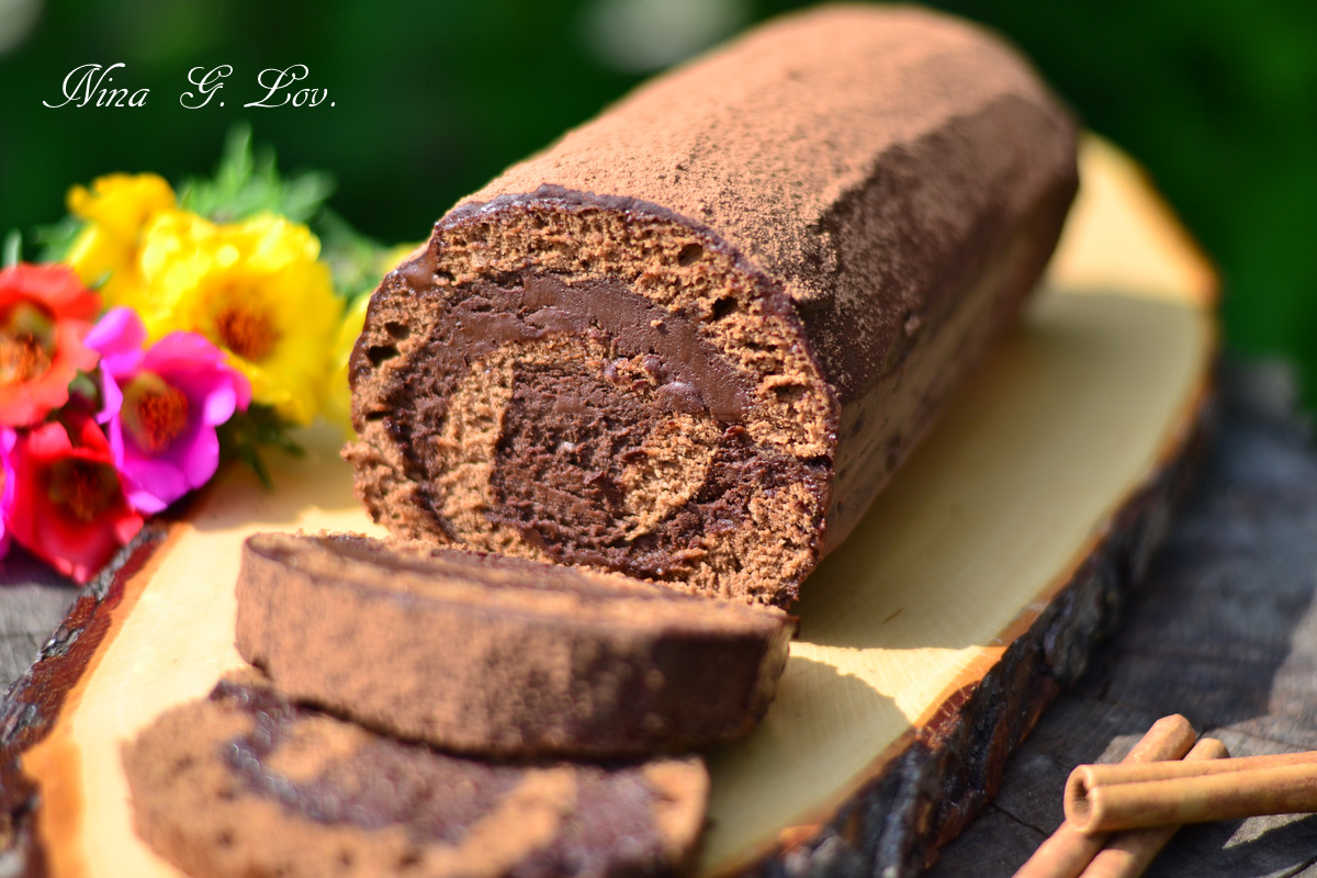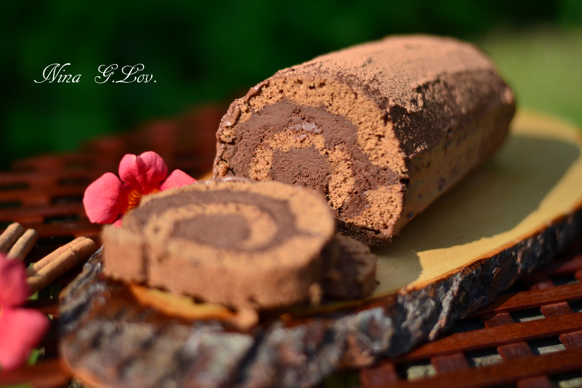 Верх готового и пропитанного рулета смазать оставшимся кремом. Так как крем плотный,разбавьте его горячими сливками и смажьте рулет этим кремом. Сверху обильно посыпьте какао-порошком. И приятного! Безумно вкусно!!!!!!!!!!!!