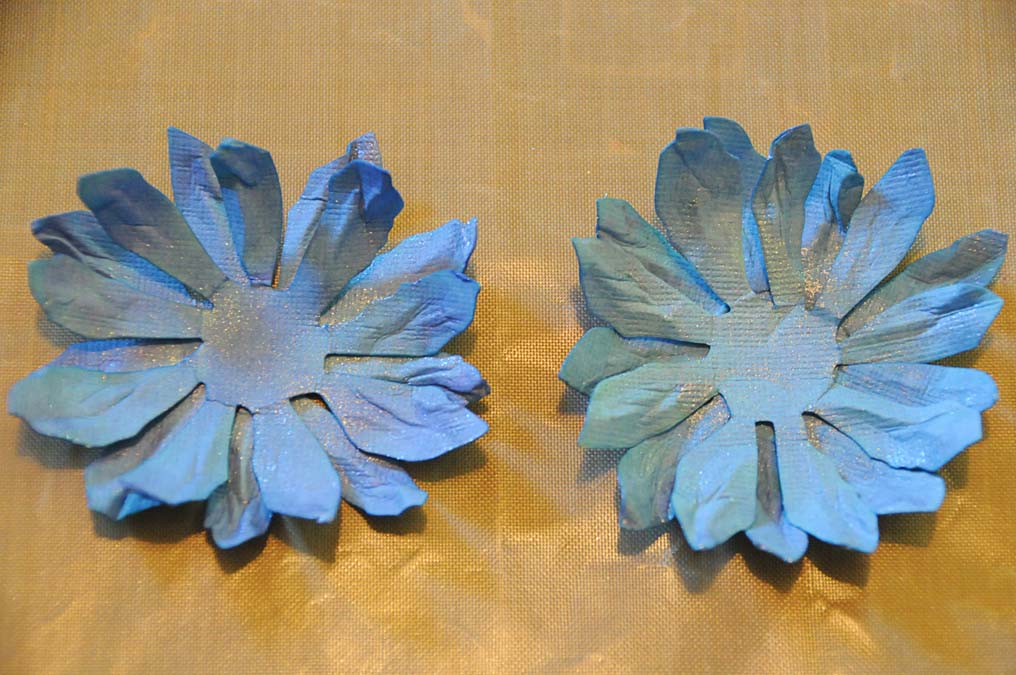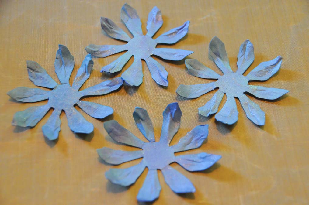 Using a craft dryer, dry them until they are 90% dry. Leave ever so damp, just enough to wrinkle the petals up a bit by pinching the individual petals until they are distressed. Then hit with the craft dryer one more time to completely dry. Or air dry.