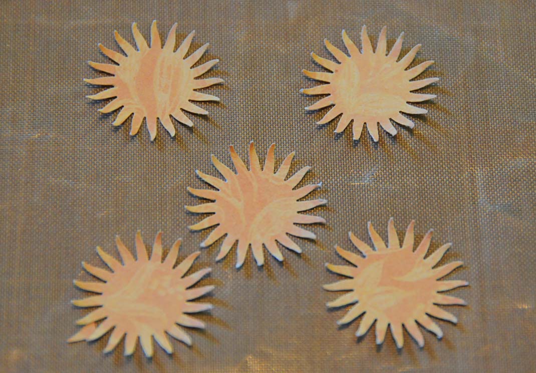 Using the thin handle of a paint brush, cup 4 of the sun shapes around the end of the brush handle and form tight cup shapes. Leave one sun shape flat.