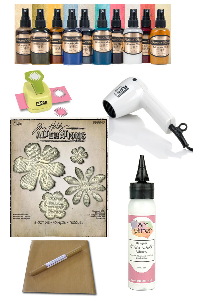 Working on a non stick craft mat, spray both sides of your flowers with your favorite color mist. I used Glimmer Mist for this tutorial.