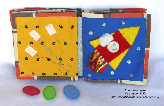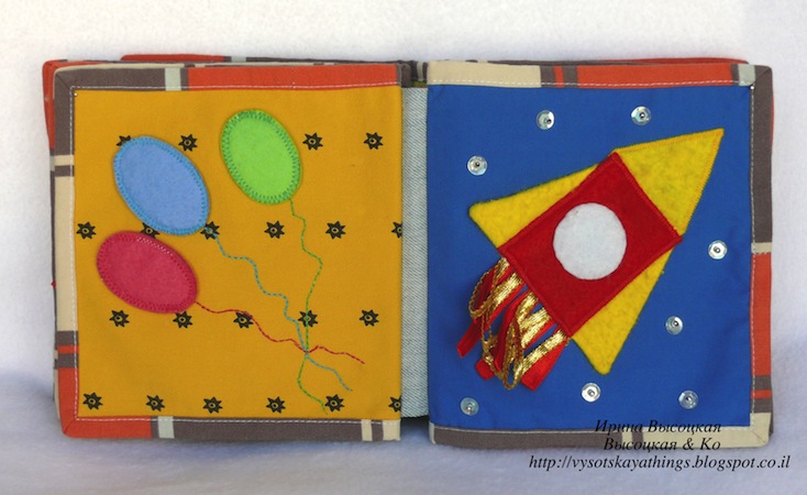 Шестая страница. Это космос. Звездное небо и летящая ракета, у которой шуршащие крылья, яркое пламя из разноцветной тесьмы и окошко со шторкой, которая открывается. Открыв шторку, мы можем увидеть космонавта (овечку). Само окошко из пластика, оно не открывается (т.к. в космосе нет воздуха и овечка может погибнуть). Звезды на небе блестят как настоящие, их можно потрогать (это пайетки с серебристыми бусинами).