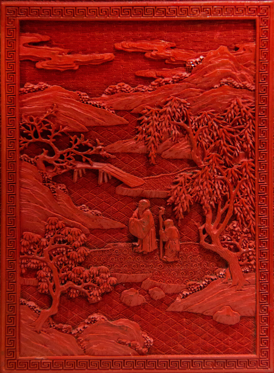 Эта крошечная коробочка, ранее считавшаяся на сегодняшний день шестнадцатым веком, может быть переназначена на четырнадцатый после сравнения с образцом, несущим образ поэта Дао Цяня, датируемый первой половиной четырнадцатого века. Большие, unarticulated формы Утесов и польза одиночной картины для фона низк-сброса подобны на обеих коробках, как толщиные взрезы используемые для того чтобы определить одежду диаграмм и большие овальные стороны с nondescript характеристиками.