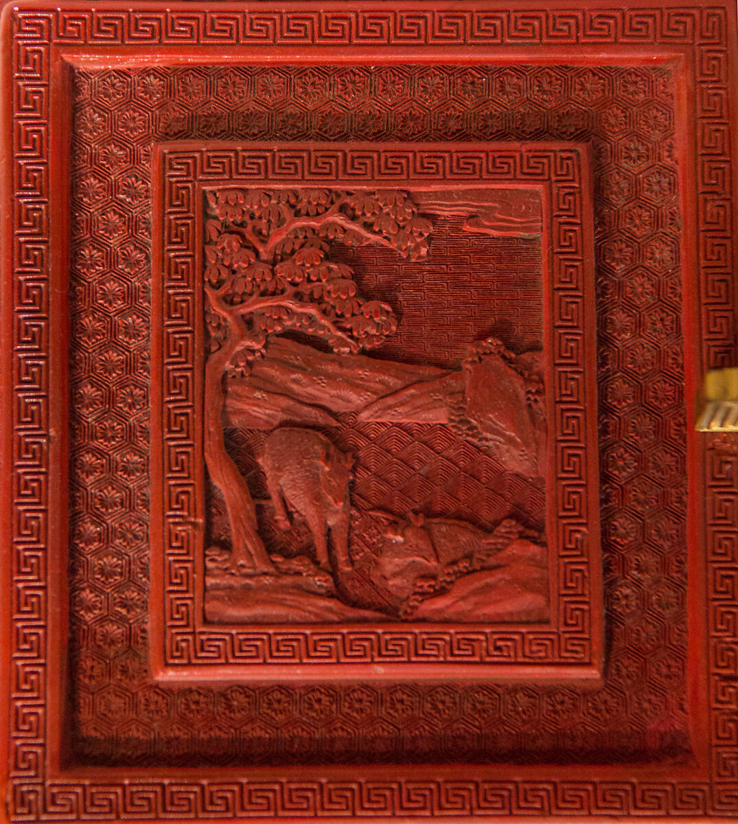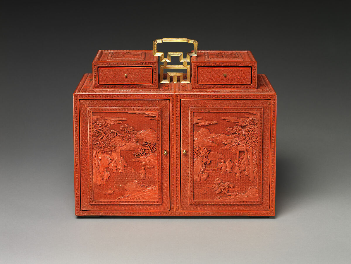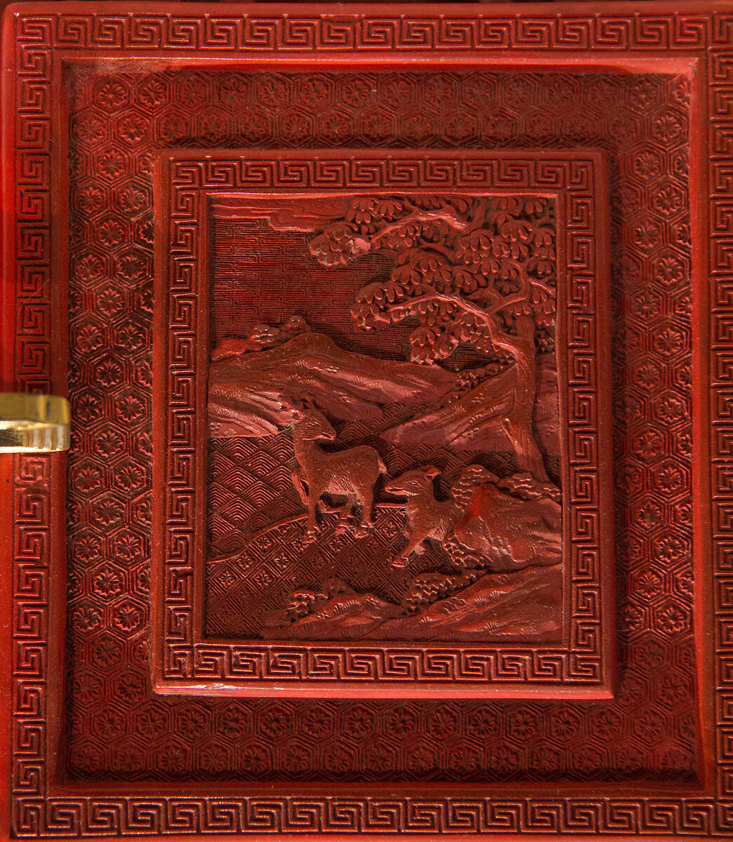 Этот двухдверный шкаф, по-видимому, представляет собой две отдельные коробки, удерживаемые вместе позолоченными бронзовыми ручками, но на самом деле это одна часть. Шесть боковых панелей представляют фигуры вдоль берега реки и на Садовой террасе с холмами, отступающими вдалеке. Олень украшают вершины двух ящиков. Резная, точная резьба красного лака характерна для цяньлунских мастерских, как и глубоко вырезанный фон парчовых узоров.