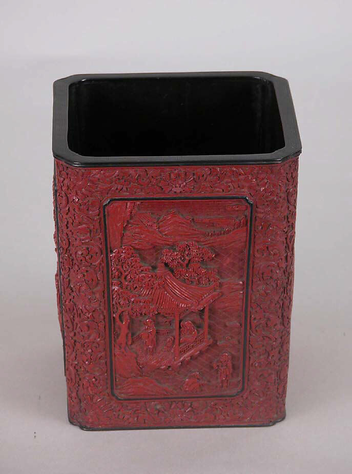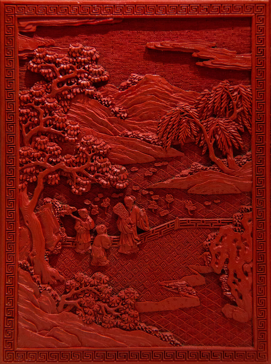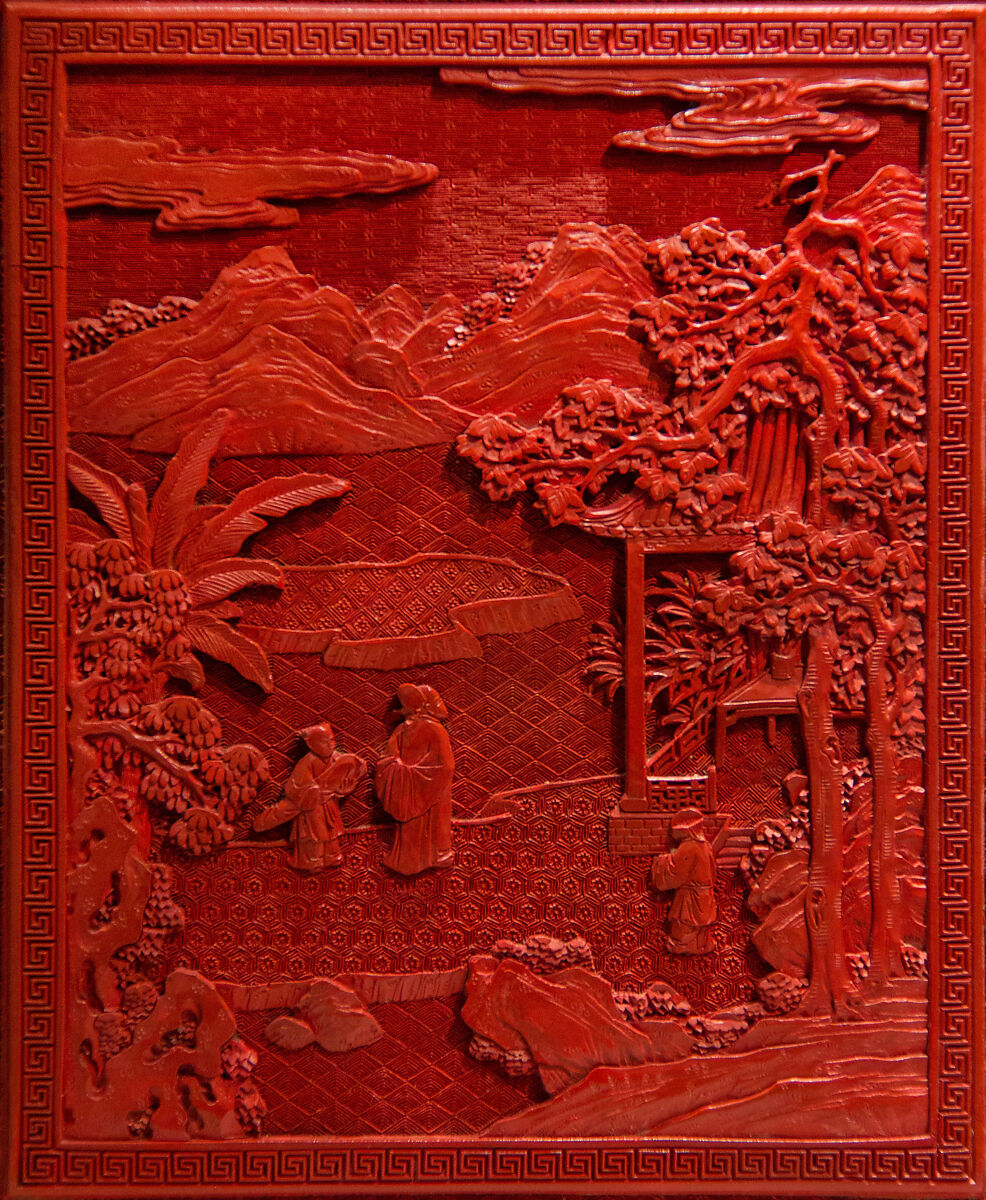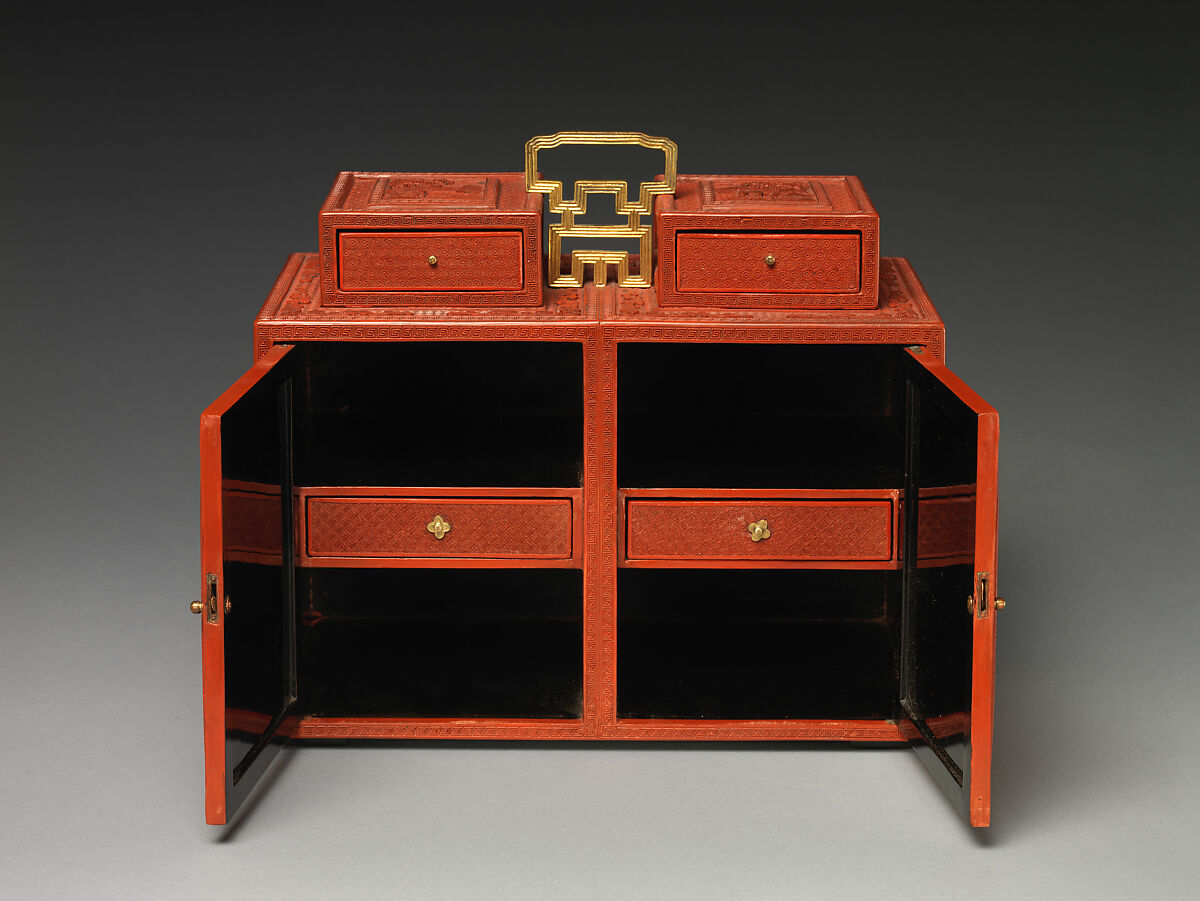 Этот двухдверный шкаф, по-видимому, представляет собой две отдельные коробки, удерживаемые вместе позолоченными бронзовыми ручками, но на самом деле это одна часть. Шесть боковых панелей представляют фигуры вдоль берега реки и на Садовой террасе с холмами, отступающими вдалеке. Олень украшают вершины двух ящиков. Резная, точная резьба красного лака характерна для цяньлунских мастерских, как и глубоко вырезанный фон парчовых узоров.