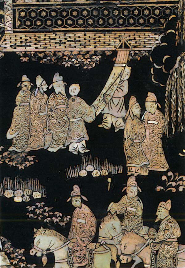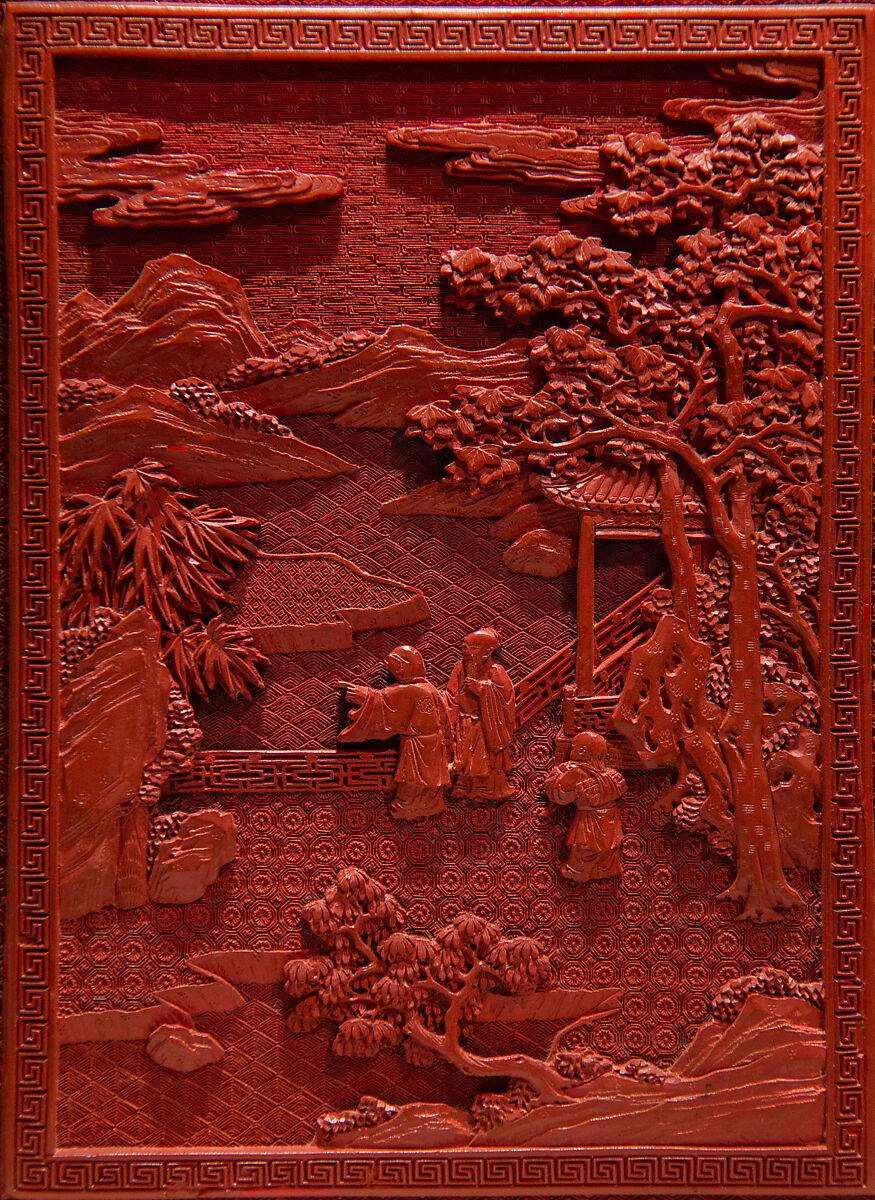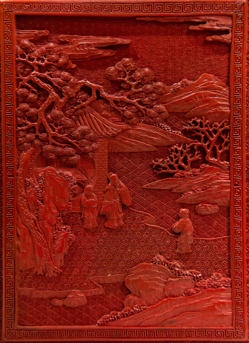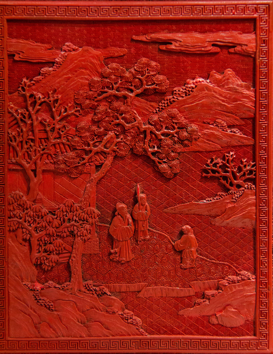 На крышке этой коробки пара сидящих мужчин отдыхают на веранде с видом на водоем. Один играет китайский цитру (Цинь), а другой слушает. Трио служителей, один в соседнем павильоне, также наслаждаются музыкой. Сцены, изображающие культурный образ жизни и художественные навыки научного класса, стали повсеместными в китайской живописи и декоративно-прикладном искусстве после XIV века