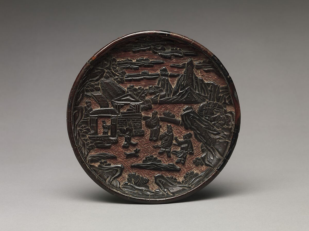Несколько особенностей помогают датировать это замечательное блюдо четырнадцатым веком. Две птицы кружат друг друга игриво в композиции, соответствующей круглой форме. Пышные цветки hollyh bloss, показанные с разных точек зрения, имеют лепестки разных размеров, которые перекрываются, чтобы предложить глубину. Длинные, узкие листья заполняют не менее трех слоев резьбы, добавляя к богатству поверхности. Неработающая темная предпосылка увиденная здесь более обыкновенно найдена в более предыдущих высеканных лаках.