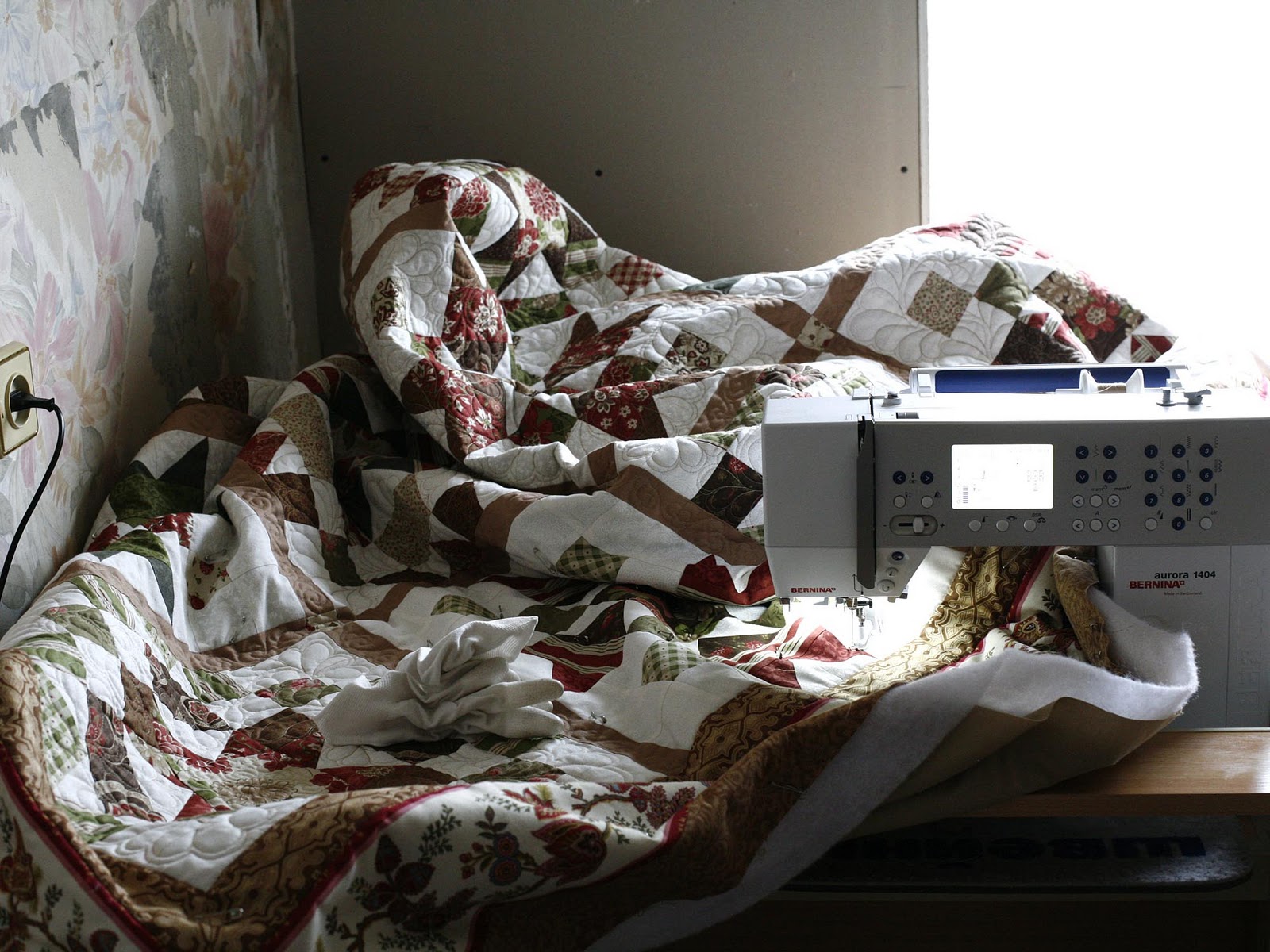 Когда присутствуют внятные прямые линии в лоскутном верхе, точность должна быть выше, для отслеживания параллельностей и т.д. я использую при сметке линейку как на фото, дорожка из синтепона, поворачивать которую тоже удобно. Булавки загнутые каждые 7-10 см. 450 булавок мне всегда на такой размер не хватает.