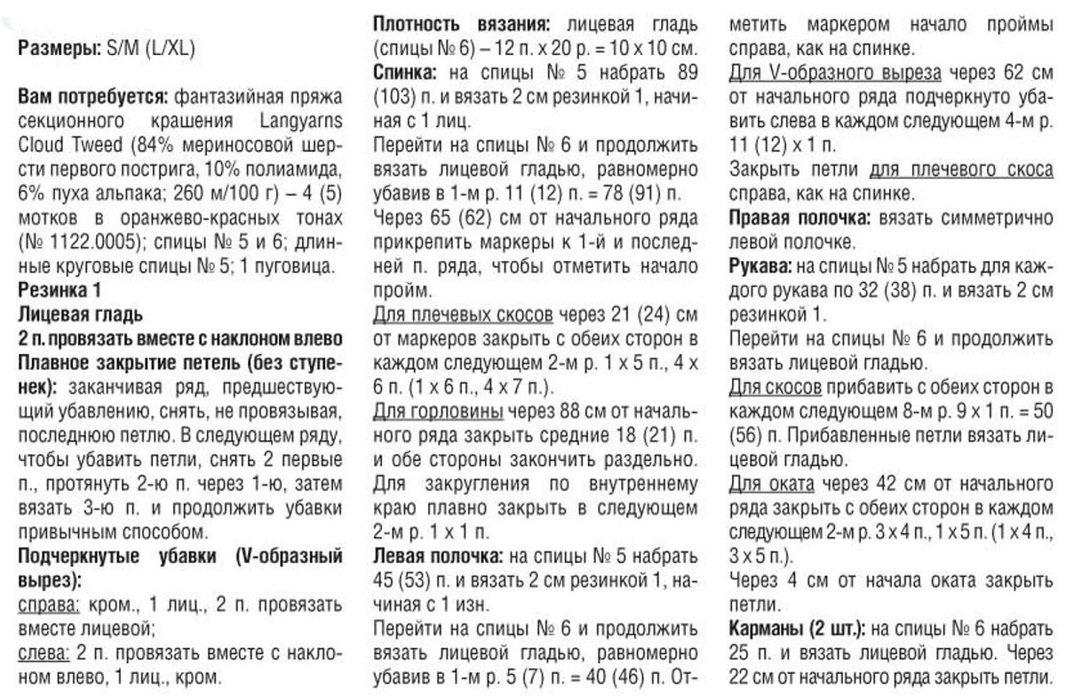 Вязать из объемной текстурированной пряжи с добавлением пуха альпака - сплошное удовольствие! Лицевая гладь в качестве основного узора - оптимальный выбор, а готовое полотно в оранжево-бежево-красных тонах с теплыми крапинками напоминает окрас экзотического животного. Просторное пальто имеет удлиненную линию плеч, на полочках предусмотрены глубокие накладные карманы, края отделаны резинкой. Застегивается всего на одну пуговицу в тон ниток.
