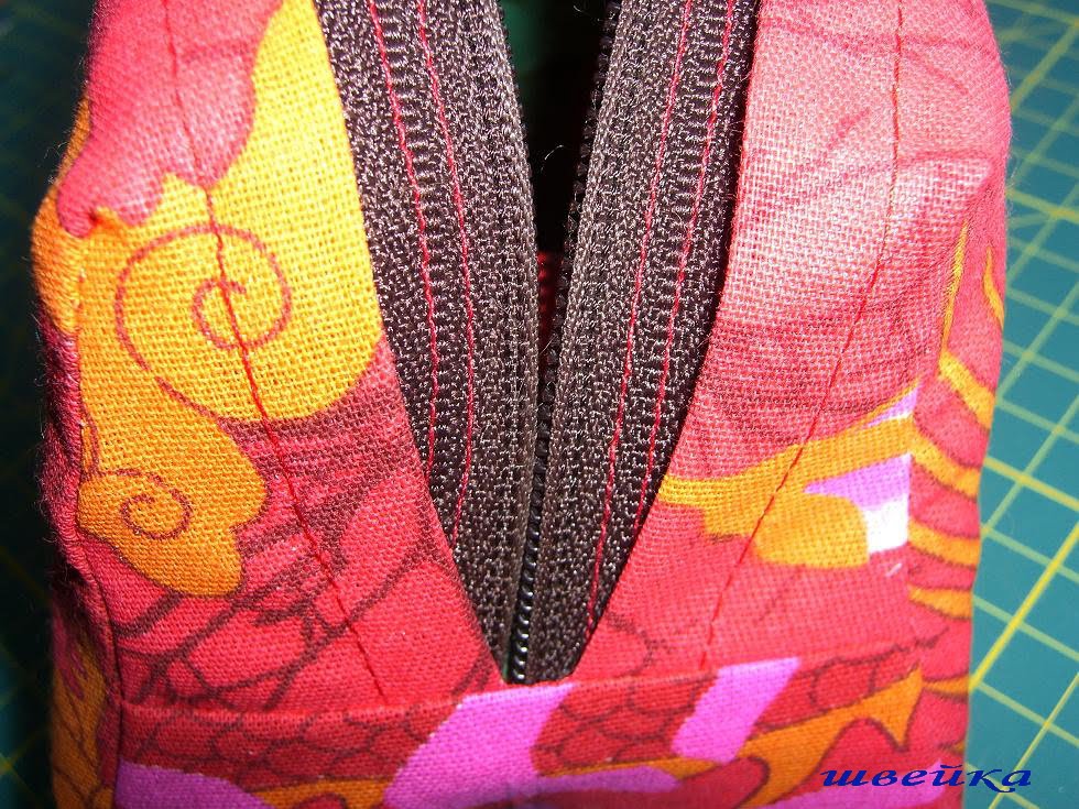 [показать] Складываем косметичку, как на фото, и прошиваем боковые части.
