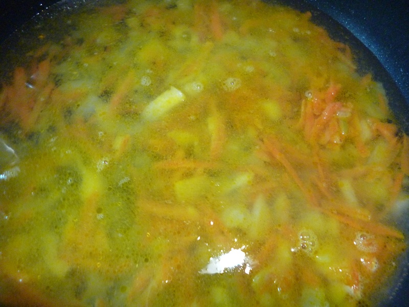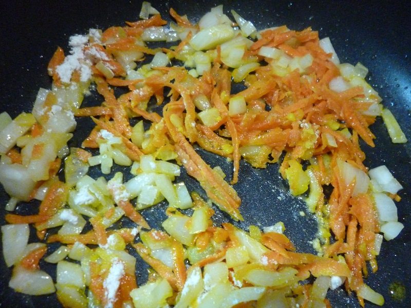 Обжарить на растительном масле лук и морковь, добавить муку и тщательно перемешать, чтобы вся мука напиталась маслом.
