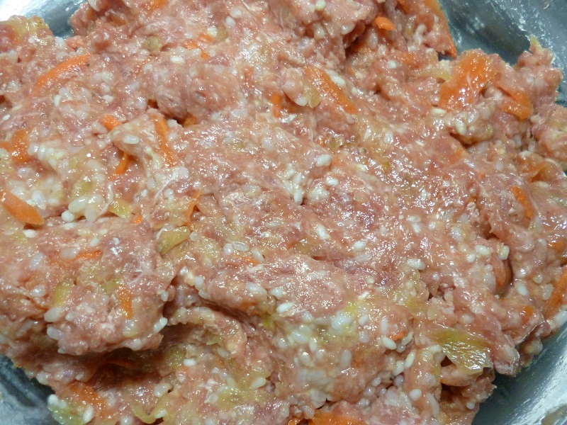 Мясной фарш, яйцо, рис, тёртая морковь, измельчённый болгарский перец и лук, чеснок, перец, соль – перемешать. Сформовать тефтельки размером с куриное яйцо.