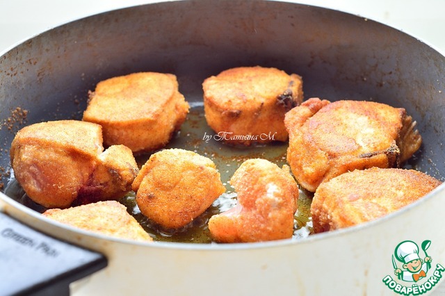 Хорошо обвалять в смеси грудку и поджарить на раскаленной сковороде на масле с обеих сторон до золотистой корочки.