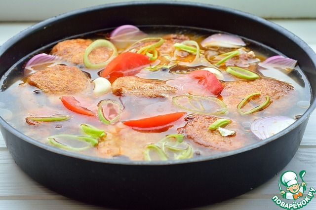Выложить в рис грудку, крупно нарезанные помидор и лук, зубчики чеснока и лук-порей (или любимую зелень).