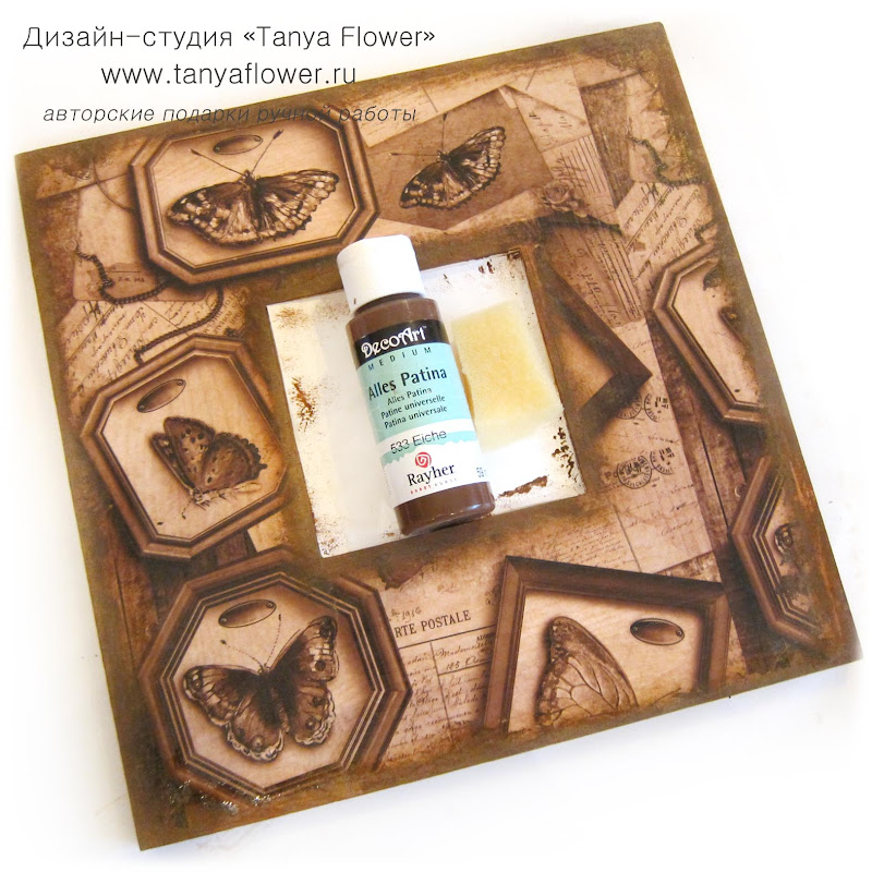 С помощью патины (в отличии от краски она более прозрачная) еще раз подчеркиваем винтажность нашей работы. Проходимся губкой по краю и по центру.