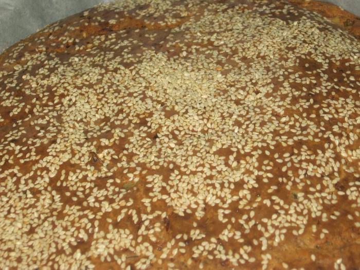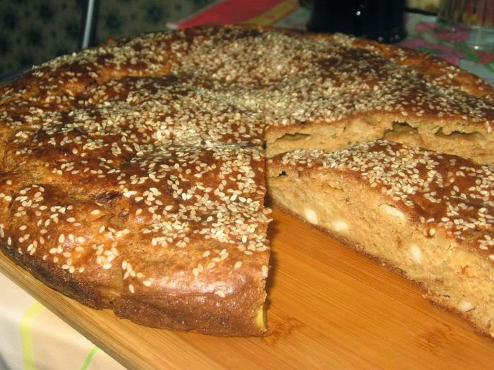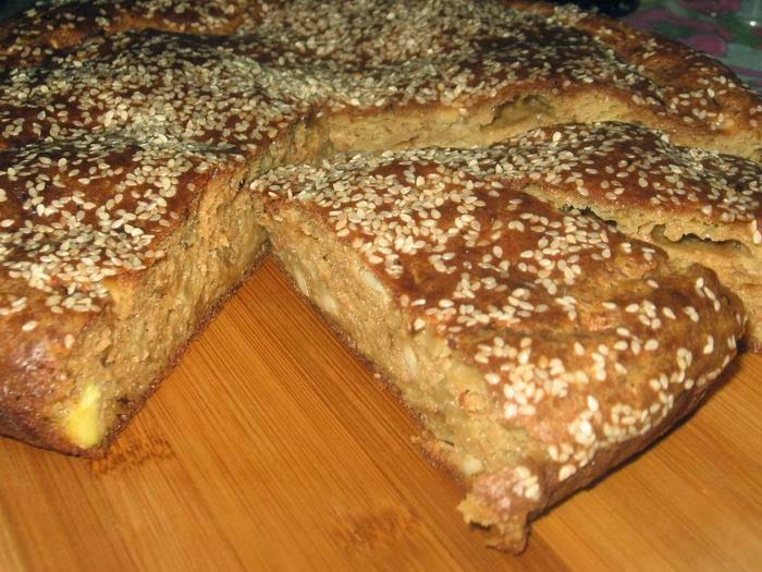 Вылить в приготовленную форму для выпечки, застеленную смазанным маслом пергаментом, или в кастрюлю мультиварки. В мультиварке пирог получится повыше, так как площать там поменьше, чем у моей формы. Сверху я посыпала кунжутом. Просто так.