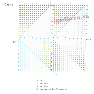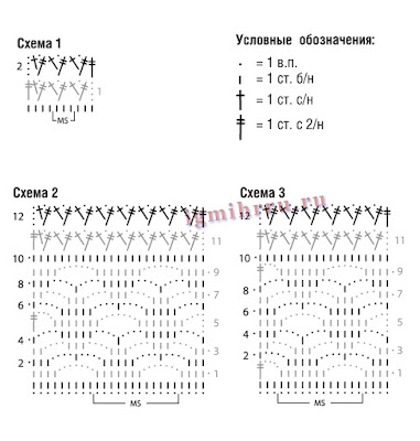 1 ðÿä. Íàáèðàåì 36 âï, âÿæåì â 5þ ïåòëþ îò êðþ÷êà 3ÑÍ â îäíó ïåòëþ, ïðîïóñêàåì 2 ÂÏ è â ñëåäóþùóþ âÿæåì 3ÑÍ â îäíó ïåòëþ, äàëåå ïðîïóñêàåì 2 ÂÏ è â ñëåäóþùóþ âÿæåì 3ÑÍ+3ÂÏ+3ÑÍ â îäíó ïåòëþ. Ïîëó÷èëàñü ïåðâàÿ âåðøèíà. Ïðîïóñêàåì 2 ÂÏ è â ñëåäóþùóþ 3ÑÍ â îäíó ïåòëþ, ïðîïóñêàåì 5 ÂÏ è â ñëåäóþùóþ 3ÑÍ â îäíó ïåòëþ, ïîëó÷èëàñü âòîðàÿ âåðøèíà. Äàëåå àíàëîãè÷íî 2ÂÏ ïðîïóñêàåì 3ÑÍ â îäíó ïåòëþ.