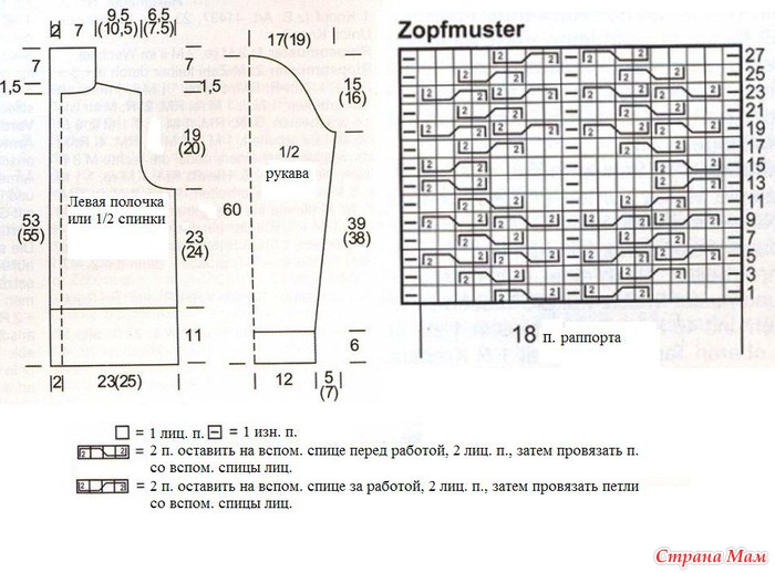 Левая полочка: Набрать 64 (68) п. и 11 см вязать резинкой. Затем петли распределить следующим образом: кром. п., 13 (17) п. основного узора, 46 п. узора коса, 1 лиц. п., 1 изн. п., 1 лиц. п., кром. п. (= в каждом р. кром. вязать изн.) На общей высоте 14,5 (15,5) см с левого края последнюю п. узора коса заменить на 1 п. изн. глади, аналогично выполнить в каждом 6-м р. еще 17 х с соответствующей п. узора коса. Для проймы рукава через 23 (24) см основного узора с правого края закрыть в каждом 2-м р. 1 х 4, 1 х 3, 2 х 2, 1 (2) х 1 п. и в каждом 4-м р. закрыть 1 (2) х 1 п. = 51 (53) п. Для скоса плеча через 19 (20) см от проймы рукава с правого края закрыть в каждом 2-м р. 3 х 6 (1 х 8 и 2 х 7) п. = 31 п. Оставшиеся 31 п. отложить.