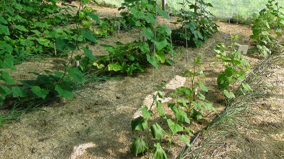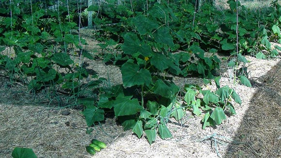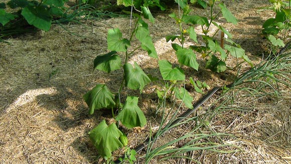 Огурцы планировалось выращивать в отсеке из полиэтиленовой пленки, натянутой поверх заборной сетки. В качеств мульчи решили применить солому, а для удобства полива – организовать капельный полив.