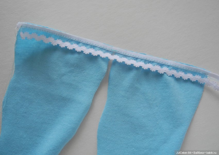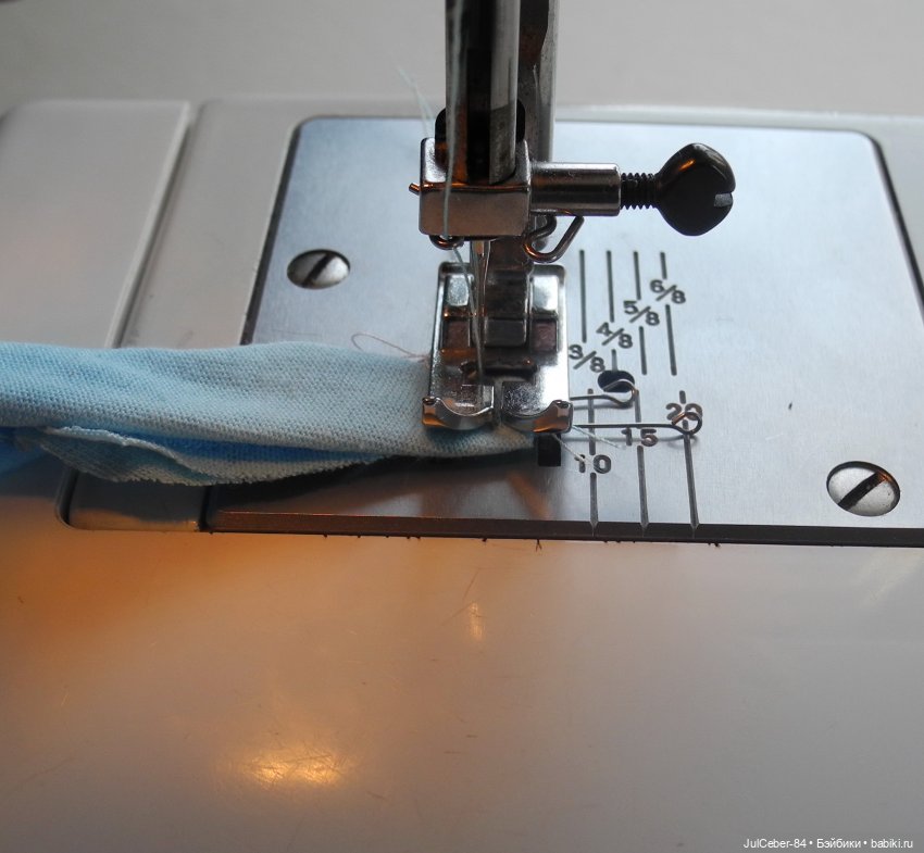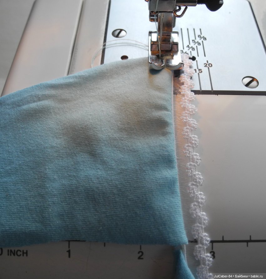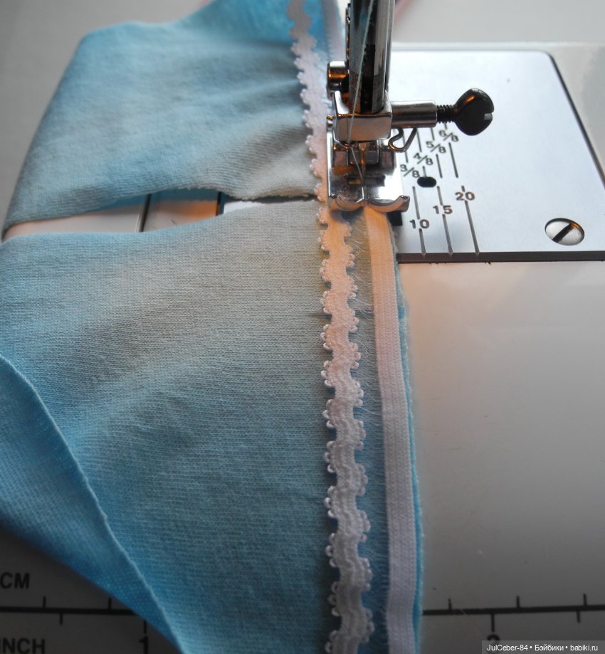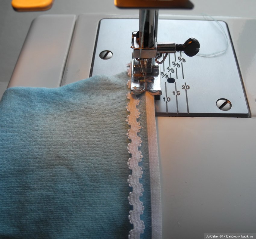пристрачиваем резинку слегка натягивая её рукой, строчку на машине выставляем ( 2 ) или пришиваем резинку вручную швом назад иголкой