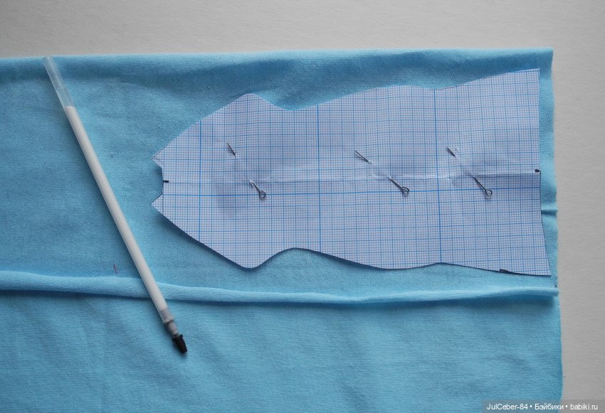 складываем трикотаж лицо с лицом, у меня он хлопковый и довольно эластичный, обводим выкройку, выкройка с уже заложенными припусками на швы