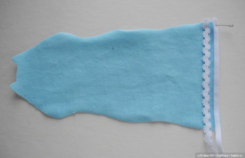 к вырезанной детали прикалываем булавкой резинку на лицевую сторону и уравниваем с краем