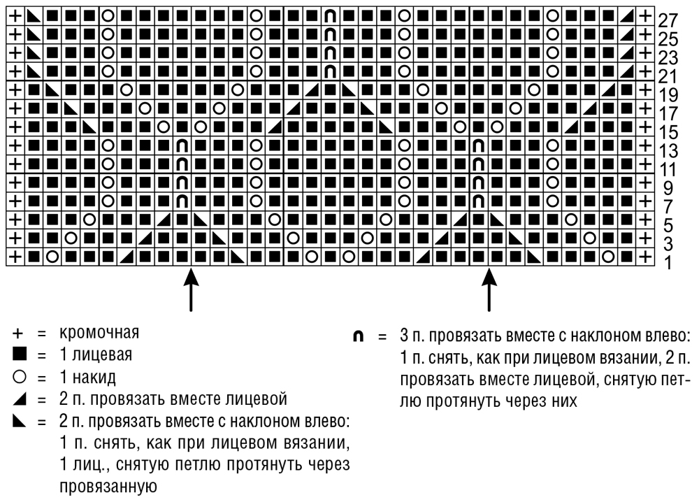 Вязать по схеме. В ширину начать с 9 п. перед правой стрелкой, повторять раппорт из 16 п. между стрелками и закончить 10 п. после левой стрелки. В высоту повторять с 1-го по 28-й ряд. При убавках следить за тем, чтобы на внешних раппортах число накидов и провязанных вместе петель в каждом ряду было одинаковым.
