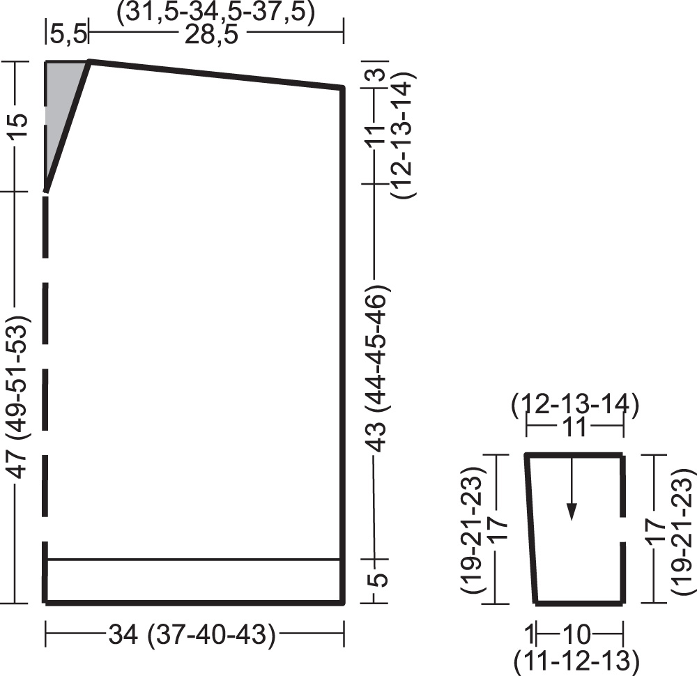 Одновременно закрыть с внешнего края через 54 (56-58-60) см = 180 (188-194-202) р. от нижней планки для плечевых скосов сначала 1 раз 15 (16-19-19) п., затем в каждом 2-м р. еще 4 раза по 15 п. (1 раз 16 п. и 3 раза по 17 п. — 4 раза по 18 п. — 4 раза по 20 п.).