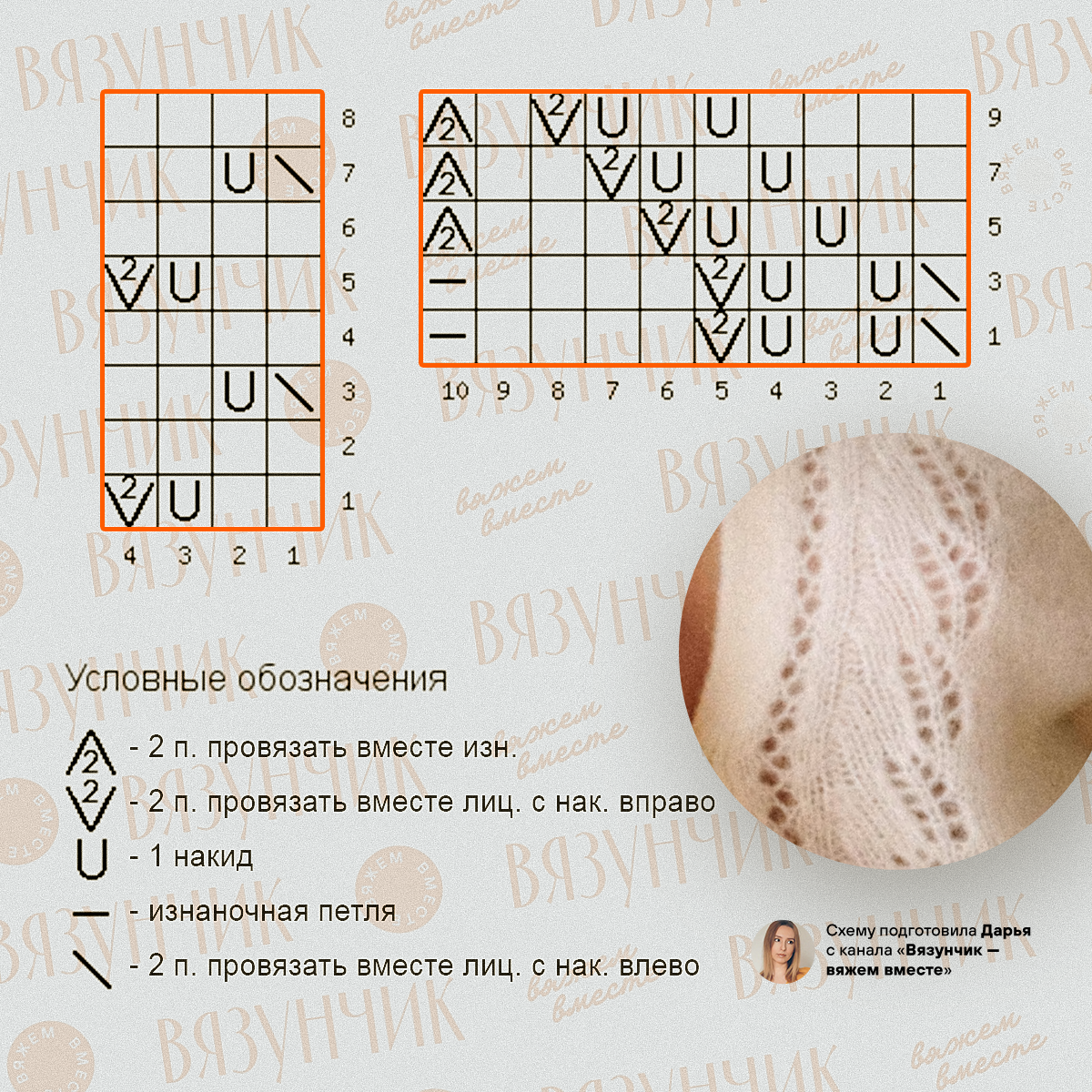 Пустые клетки на схемах — это лицевые петли. Обе схемы даны для кругового вязания. На них по одному раппорту. Указаны лицевые и изнаночные ряды.
