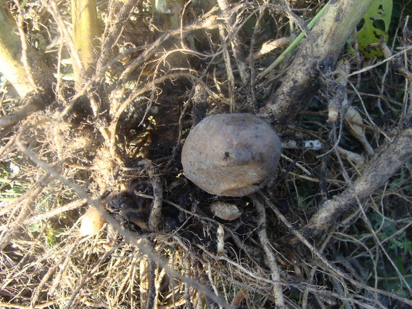 Остальные клубни куста продолжают нарастать. Вынужден признать, что холмики не позволяют обнаружить 100 % всех крупных клубней. Некоторые столоны забираются в почву по ходам червей, и клубни образуются ниже рыхлого слоя. Их иногда можно обнаружить по трещинам в почве.
