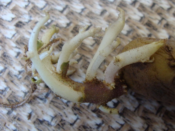 Дополнительные корни появляются только во влажном субстрате. Встал вопрос: как увеличить длину стебля под поверхностью почвы, не заглубляя клубни? А ответ оказался очень простым. Нужно просто прорастить клубни до длины растков 2-3 см и сажать семенной материал вниз ростками. Точней, я располагаю клубень так, чтобы ростки были под клубнем, и максимально контактировали с почвой — бочком.