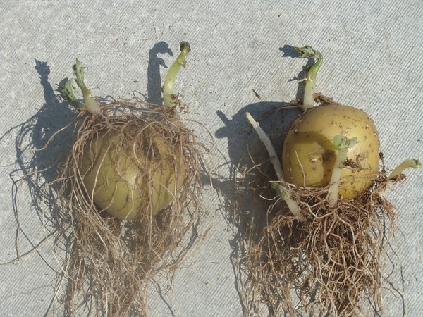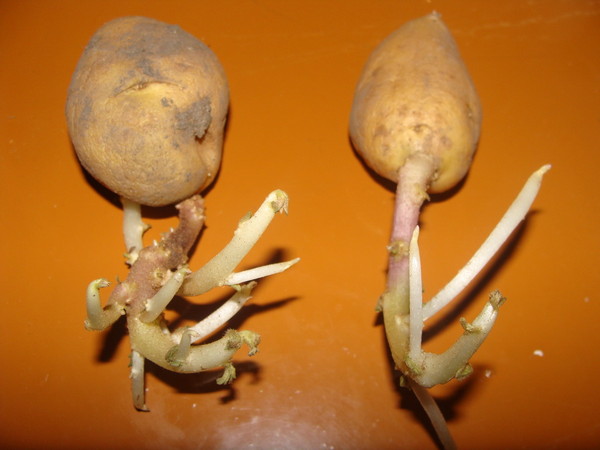 Происходит как бы эффект окучивания, без окучивания. Сравните длину белого участка на левом клубне — обычная посадка, и на правом — вниз ростками.