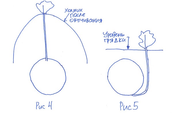 При посадке вверх ростками наростить такую же длину подземной части стеблей можно с помощью окучивания(сравните рисунки 4 и 5. На обоих рисунках длина этиолированного стебля одинакова). Посадка ростками вниз позволяет избежать этой трудоемкой и задерживающей развитие картофеля операции.