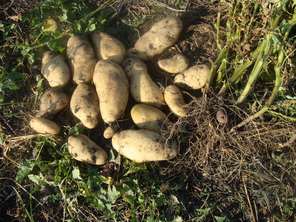 Причем клубни в таких кустах все крупные. Сравните на фото 3 маточный клубень и клубни урожая. Это я обьясняю отсутствием конкурентной борьбы внутри куста. В обычном многостебельном кусте каждый стебель — отдельное растение. И они конкурируют между собой за свет и питательные растворы. В итоге на каждом стебле-растении образуются 1-2 крупных или много мелких клубней. На растении, вырасшем из одного, но разветвленного под землей ростка клубни крупные. А за счет увеличенного этиолированного участка стеблей, клубней много.