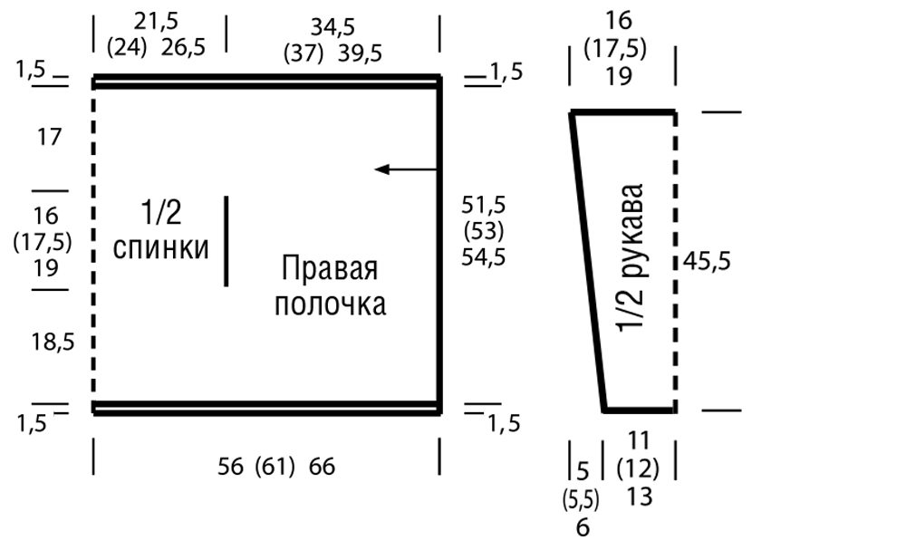 Полочки и спинку вязать поперек единым полотном, начиная с правой полочки (см. стрелку на выкройке).