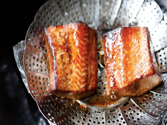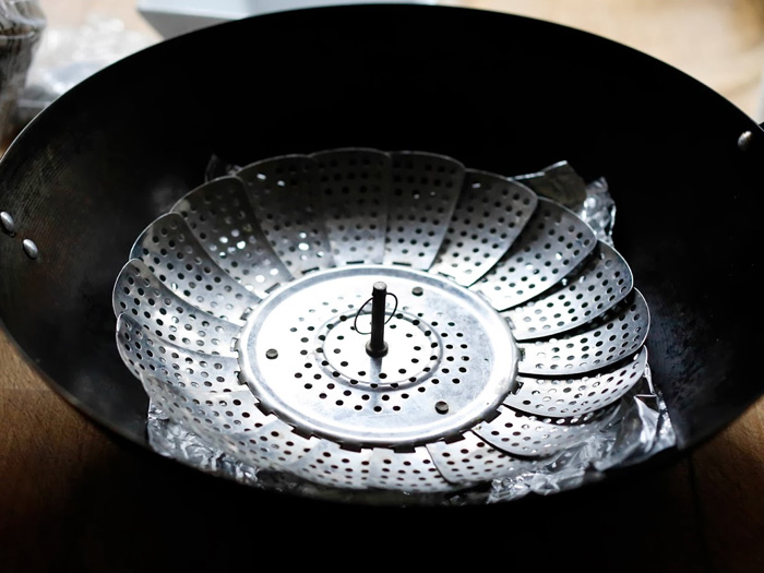 Поверх второго слоя фольги следует установить подставку для варки на пару.