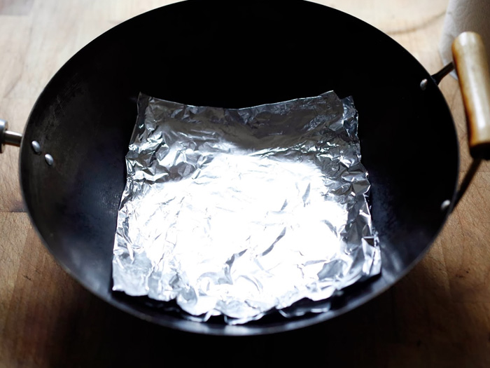 Дно кастрюли или сковороды необходимо застелить фольгой, поверх нее высыпать стружку и снова застелить слоем фольги.