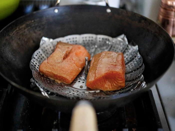 Сковороду или кастрюлю накройте крышкой и обернить вокруг нее фольгу. Поставьте на сильный огнь на 5 минут, затем убавьте пламя до среднего и продолжайте коптить еще 10-15 минут, если вы готовите небольшие куски рыбы или курицы, или 30-40 минут, если это большие куски, как, например, свиная лопатка.