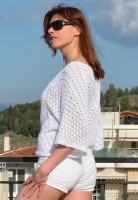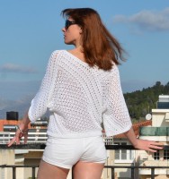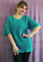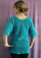 Легко драпирующаяся форма этого пуловера дополнена V-образным вырезом и короткими свободными рукавами, благодаря которым пуловер можно носить поверх другой одежды или самостоятельно. Этот пуловер вяжется очень просто, потому что перед, спинка и рукава выполнены как 4 одинаковые части, а затем сшиты вместе определенным образом. Если вы уже вязали изделия сверху вниз и ищете что-то необычное, вам понравится эта креативная идея.