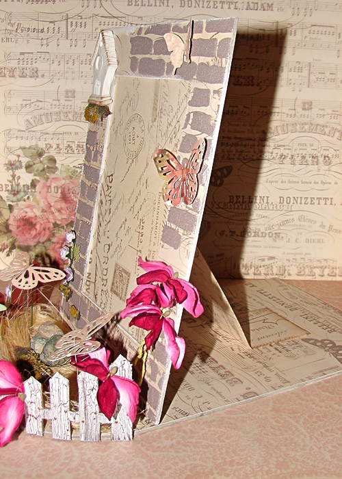 Вырезаем полоску из картона размером 23 на 5 см. Обклеиваем ее скрап бумагой. С каждой стороны отступаем по 5 см и бигуем. На обратной стороне приклеиваем заднюю стенку и подставку для рамки. Все, рамка готова.