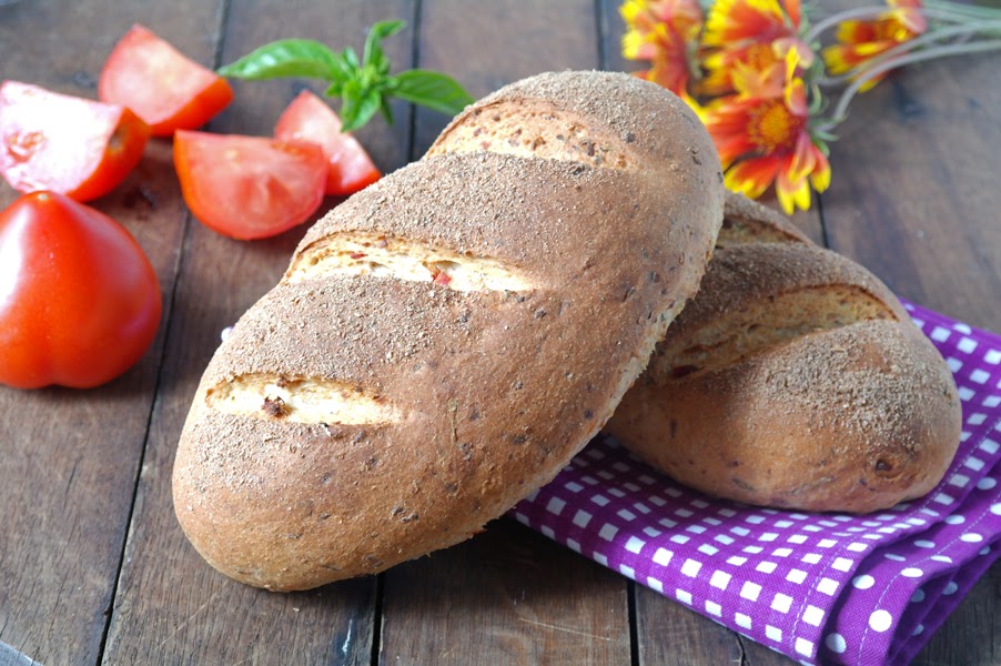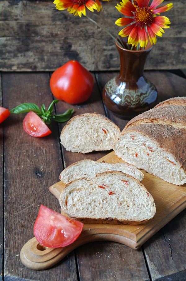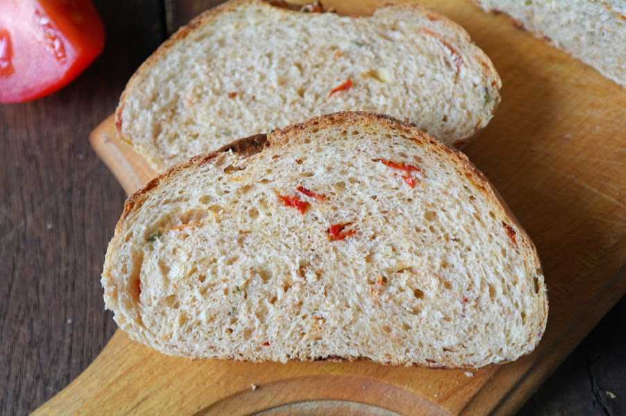 Хлеб получается мягкий, вкусный и пикантный. Сочетание пармезана, помидоров и перца дают отличный результат.