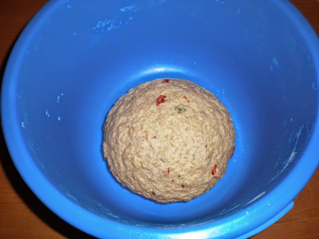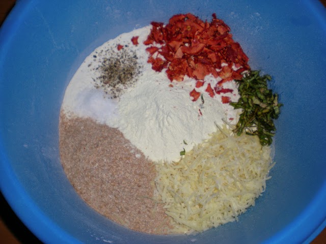 Просеять муку, добавить отруби, сухое молоко, соль, тертый пармезан, нарезанный мелко базилик, мелко нарезанные вяленые помидоры, черный молотый перец. Все ингредиенты смешать. По рецепту базилик нужен сушеный, но у меня на грядке рос свежий, поэтому я использовала свежий.
