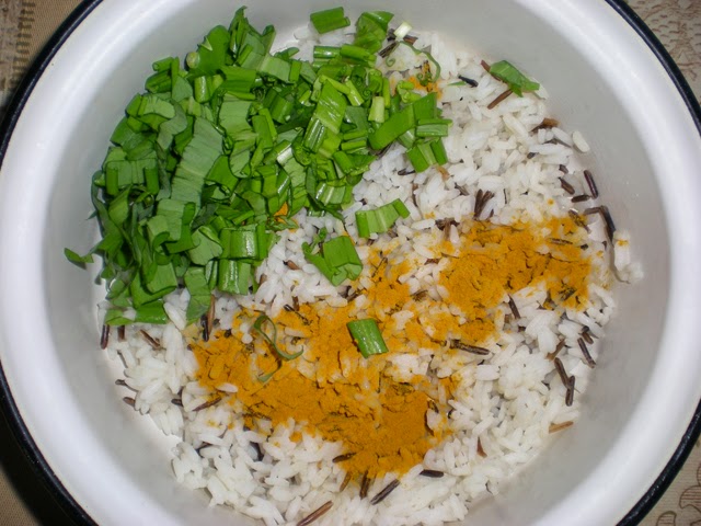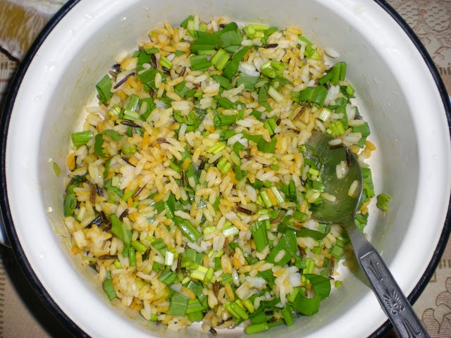 Охлажденный рис смешать с нарезанной черемшой и куркумой. (Это уже не первый мой опыт сочетания рыбы и черемши – получается очень вкусно!)