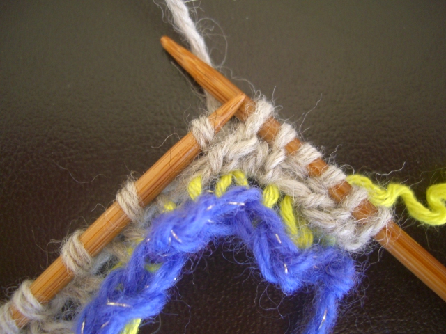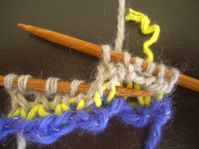Следующий этап - нужно поднять из 1го ряда основного цвета из протяжек дополнительно по 2 петли.