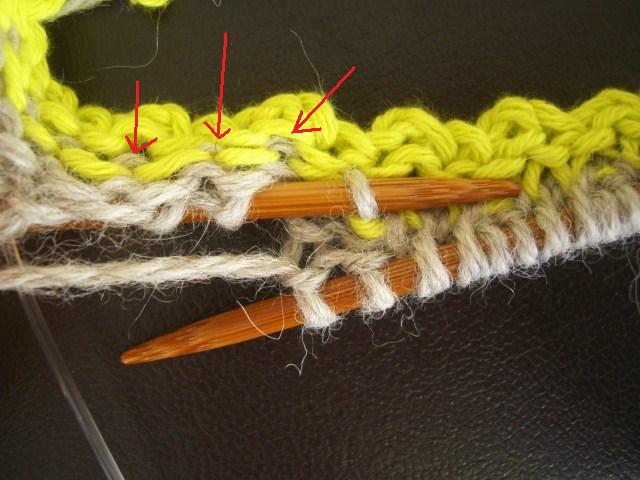 Показываю второй способом. По изнаночной стороне хорошо видно за какие дужки надо поднимать петли - самые нижние, где проходит нить основного цвета.